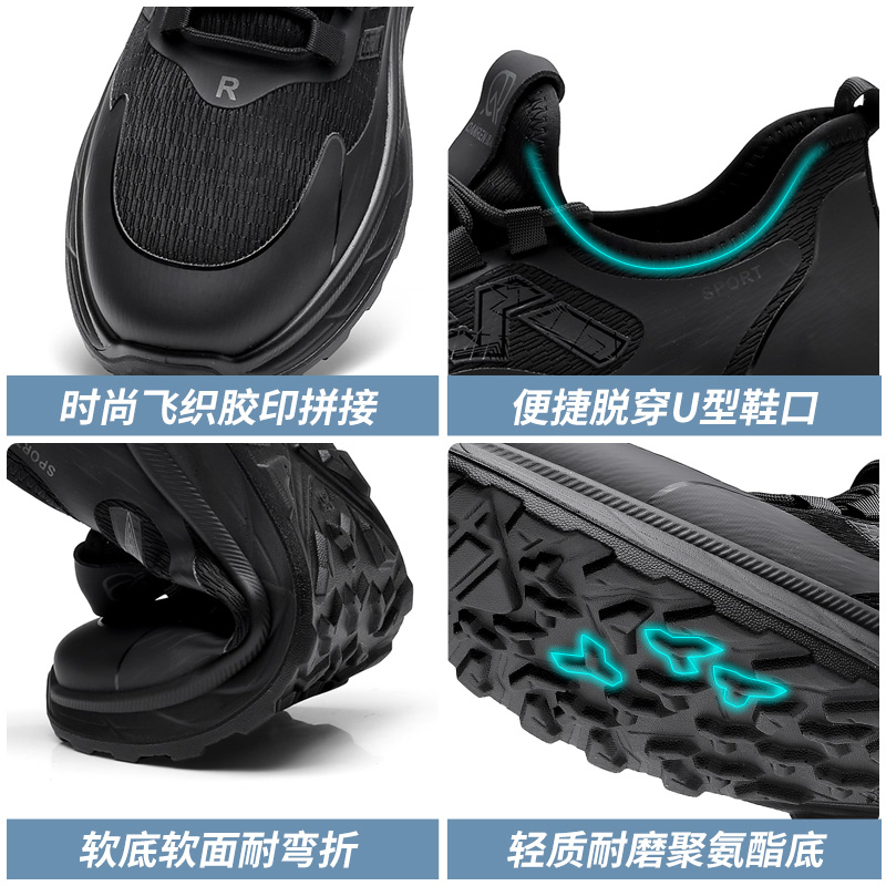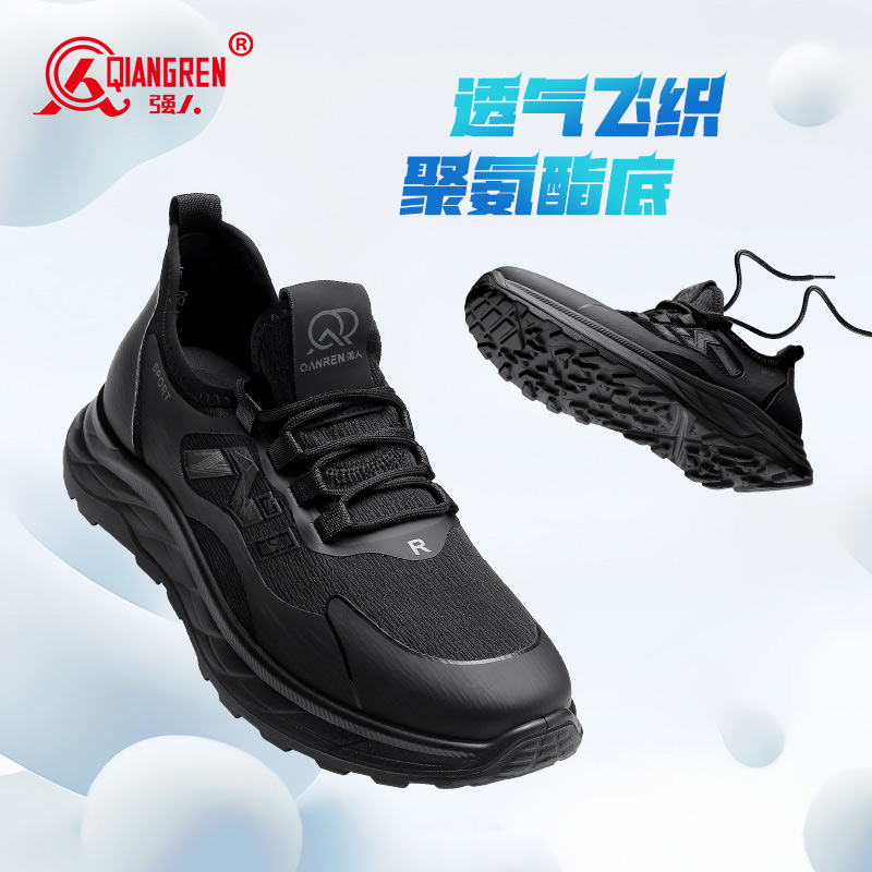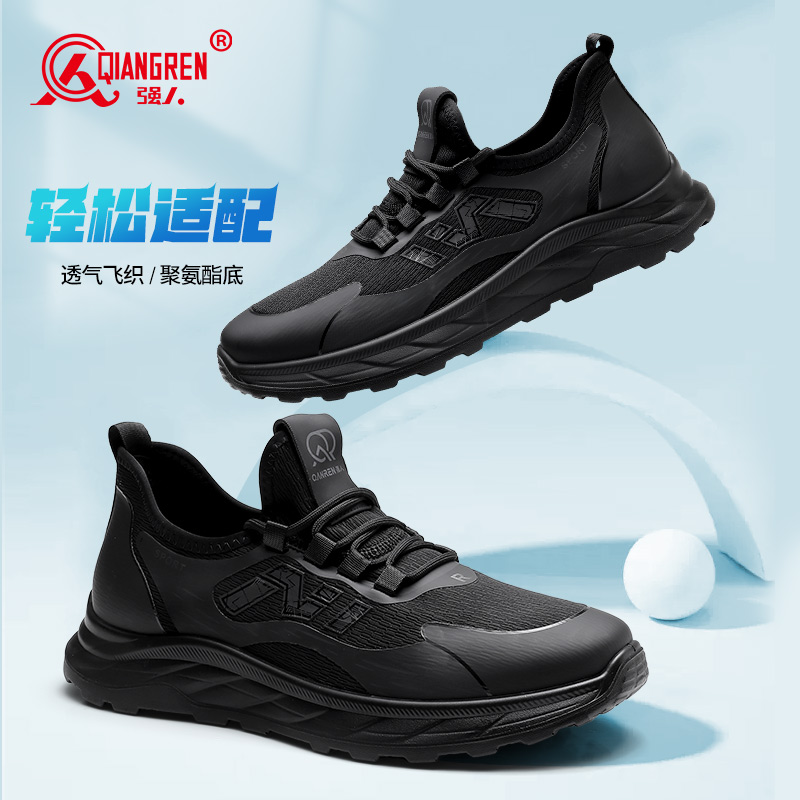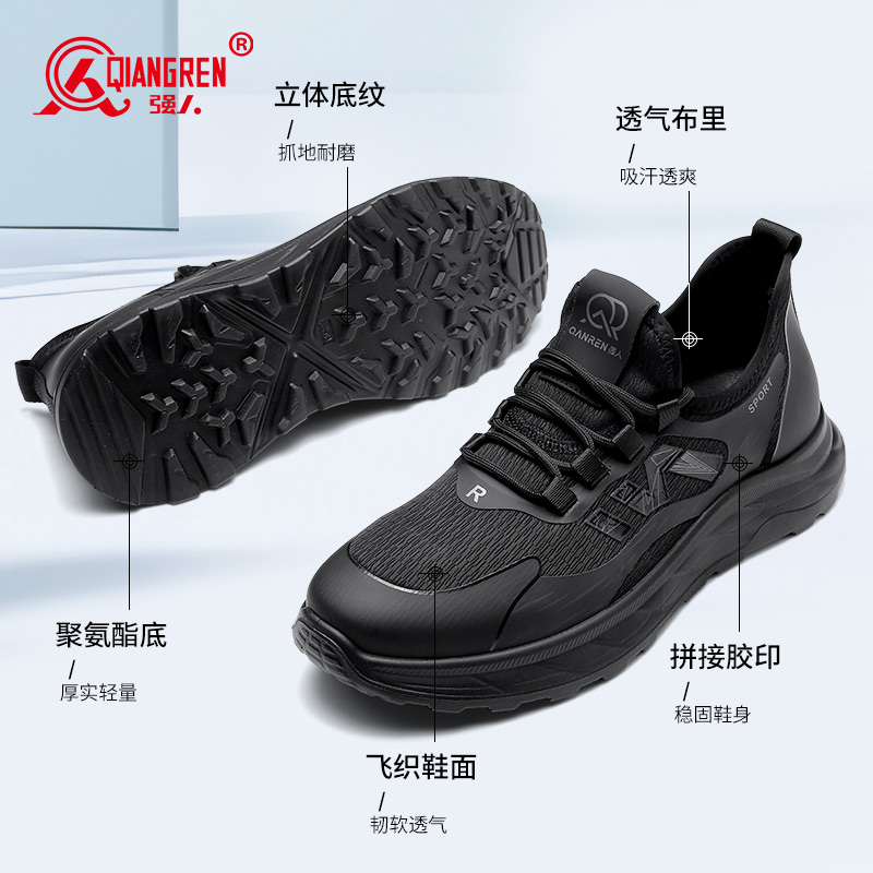 强人3515男鞋2025春季新款运动休闲鞋跑步鞋厚底飞织黑色通勤训练鞋子073266